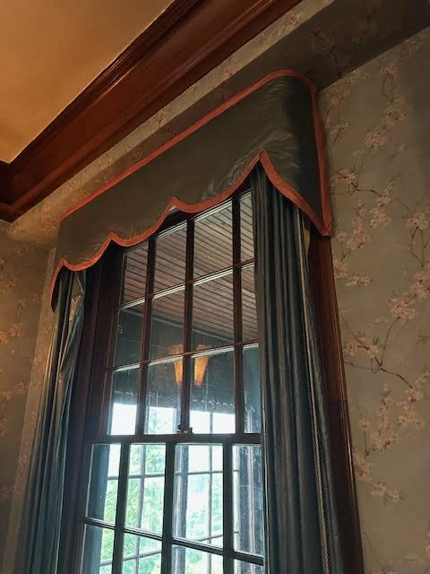 This is the drapery treatment that I am enthralled with. It is so simple but so elegant with the soft shapely valance. The panels had the trim also on the bottom. I am SO doing this!